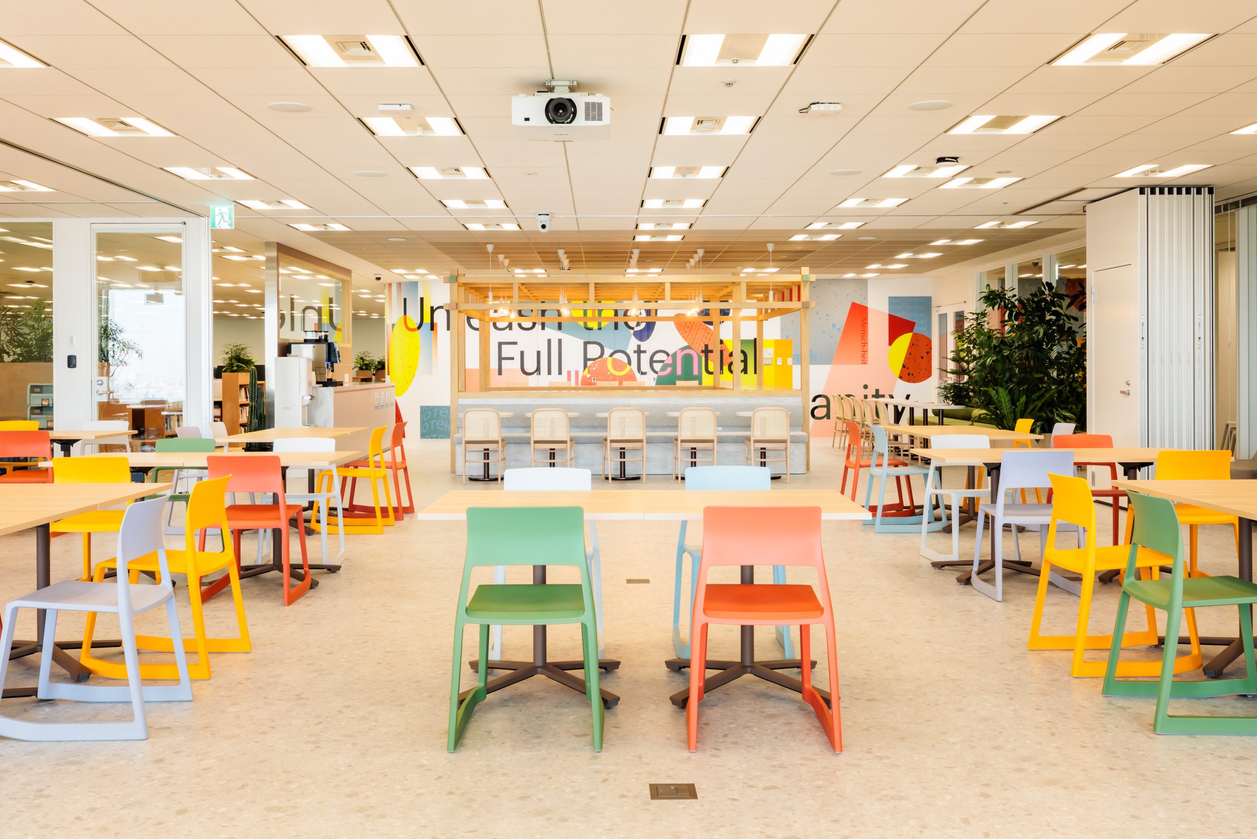 新オフィスは「FRAME(枠)」をコンセプトに掲げ、組織や企業の”枠”を超えた繋がりの促進と、従業員自身の”枠”を超えたチャレンジが生まれる空間設計となっています。広々としたカフェエリアには当社のミッション「Unleash the full potential of humanity and change the world.(全人類の能力を全面開花させ、世界を変える。)」を壁面デザインに施し、いつでも当社の原点に立ち返ることができます。オフィスデザインや家具一つ一つのデザイン性にこだわり、従業員一人一人のクリエイティビティが発揮でき、創造的なコミュニケーションが生まれるオフィスを目指しました。また、ウェルビーイング向上のためにオフィスの随所にリアルプランツを多く採用し、あらたに社食制度も導入いたしました。2026年には匿名Q&Aプラットフォーム「mond」の本格的な海外展開を視野に入れており、グローバルなオフィス設計を意識しつつもリフレッシュスペースの一部に和室を採用し、和洋折衷を取り入れています。